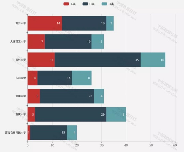 南开大学拥有5个A类学科和9个“A-”学科,吉林大学拥有2个A类学科和9个“A-”学科,重庆大学拥有3个“A-”学科,东北大学拥有1个A类学科和3个“A-”学科,湖南大学拥有5个“A-”学科,大连理工大学拥有2个A类学科和5个“A-”学科,而在2012年的学科评估中表现较好的西北农林科技大学,在第四次评估中只有一个学科被评为A-。