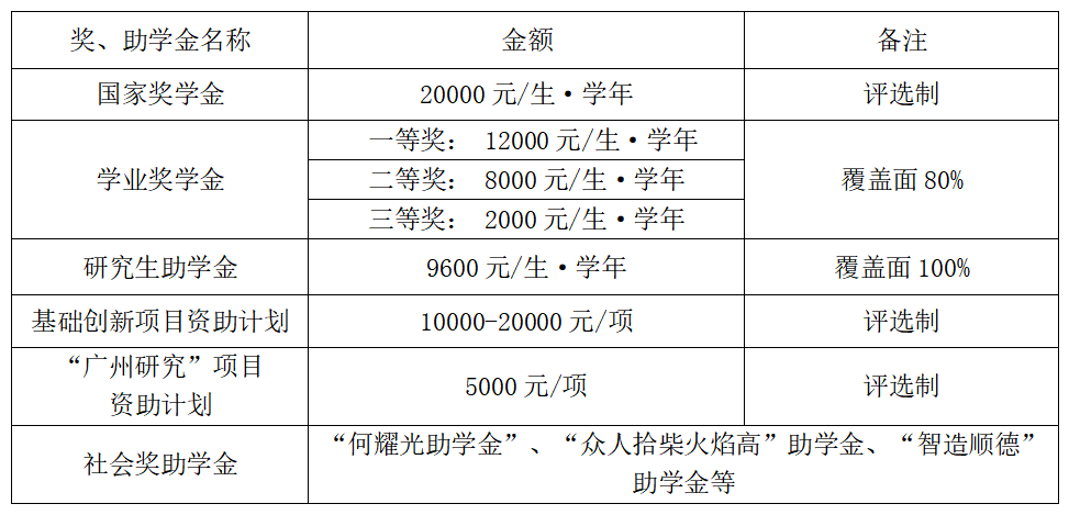 学校设有助学金(覆盖面100%)、学业奖学金(覆盖面80%)、国家奖学金,以及各类科研资助、社会设置的奖学金等(奖学金具体政策以学校和学院的最新规定为准)。